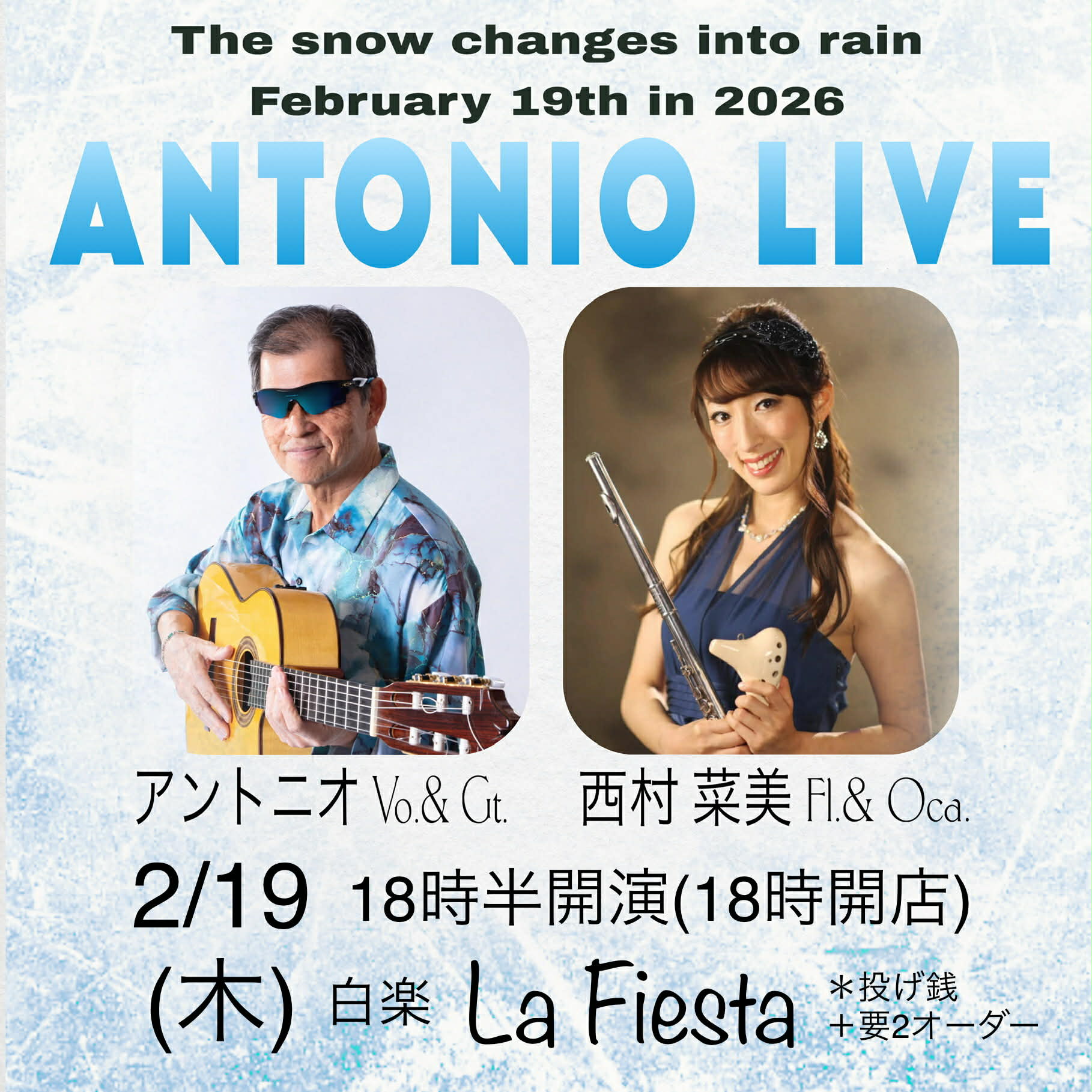 週末ライブにお越しのみなさま、どうもありがとうございます!今週ライブのご案内です。 2/18(水)中村早智ボーカルライブ・・・出演:中村早智(ボーカル)、穂積翔太(ギター)OPEN 18:30 START 19:30 CHARGE なし(投げ銭)+2オーダー 2/19(木)アントニオ・デュオ・・・出演:アントニオ(ボーカル、ギター)、西村菜美(フルート、オカリナ)OPEN 18:00 START 18:30 CHARGE なし(投げ銭)+2オーダー