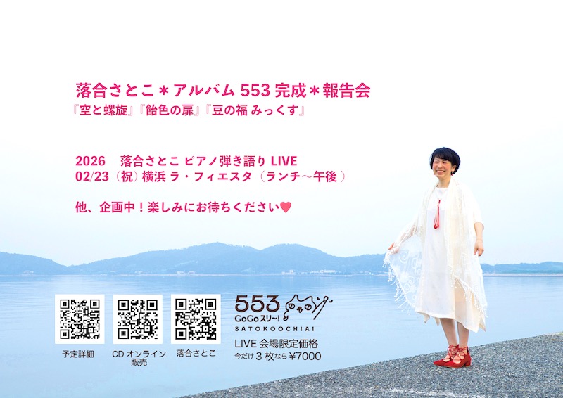 2/23(祝)落合さとこ*アルバム553完成*報告会・・・出演:落合さとこ(ボーカル、ピアノ)OPEN 12:00 START 13:00 CHARGE 3,000円+フード&ドリンクオーダー