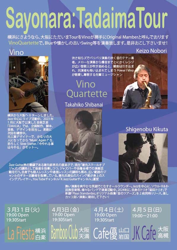 週末のライブにお越しのみなさま、どうもありがとうございます!月末月初もライブが続きます♪ *4月のライブ・スケジュール、アップしました! 3/31(火)Sayonara:Tadaima Tour・・・出演:vino(ボーカル)、登敬三(サックス)、菊田茂伸(ベース)、柴内貴彦(ギター)OPEN 19:00 START 19:30 CHARGE 4,000円+2オーダー 4/1(水)森山潤一デュオ・・・出演:森山潤一(ウクレレ)、穂積翔太(ギター)OPEN 18:30 START 19:30 CHARGE なし(投げ銭)+2オーダー