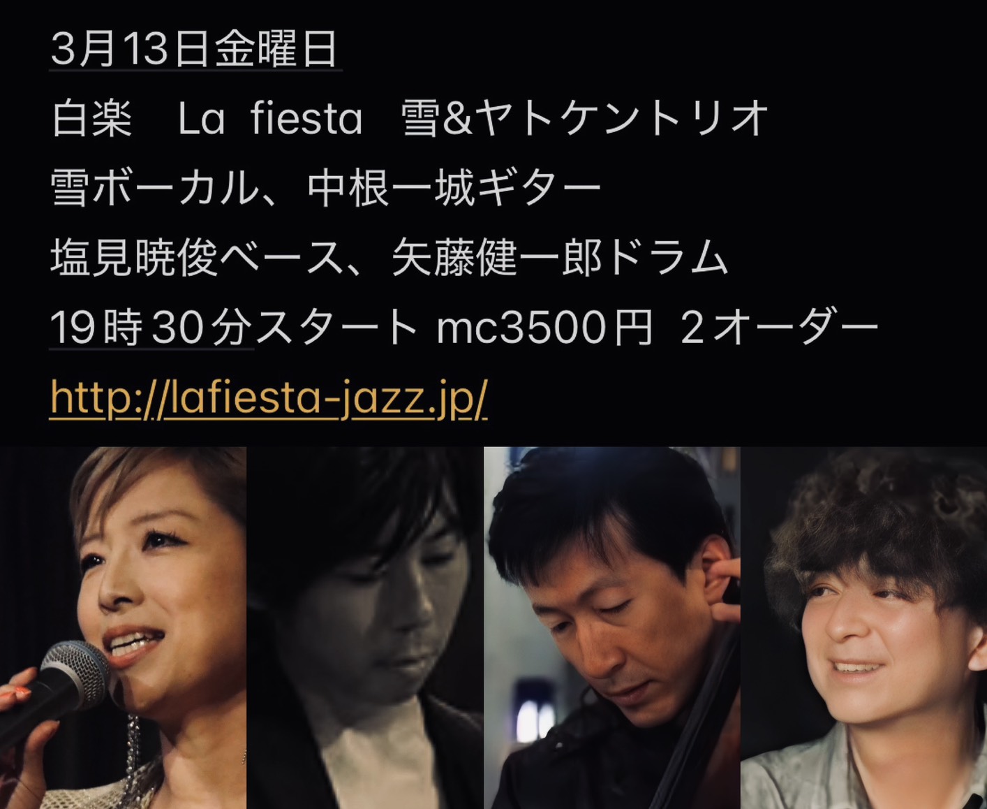 きのうの中村早智ボーカルライブにはおかげさまで大勢のみなさまにお越しいただきました!みなさま、どうもありがとうございます!今週ライブが続きます♪ 3/12(木)志賀由美子ソロ・・・出演:志賀由美子(ギター、ボーカル)OPEN 18:30 START 19:30 CHARGE なし(投げ銭)+2オーダー 3/13(金)雪&ヤトケントリオ・・・出演:雪(ボーカル)、中根一城(ギター)、塩見暁俊(ベース)、矢藤健一郎(ドラム)OPEN 19:00 START 19:30 CHARGE 3,500円+2オーダー 3/14(土)弾き語りパスタFESTA vol.183・・・出演:大澤貴文、なかまちひろし、はまのらま、林あきひこ OPEN 11:30 START 11:55 CHARGE 2,300円(パスタ&1ソフトドリンク付き) 3/15(日)初川みちボーカルライブ・・・出演:初川みち(ボーカル)、下梶谷雅人(ギター)、山本詠(ベース)、矢藤健一郎(ドラム)OPEN 13:30 START 14:00 CHARGE 3,500円+2オーダー *この日はライブのみの営業です。通常ランチ・ディナーは実施いたしません。